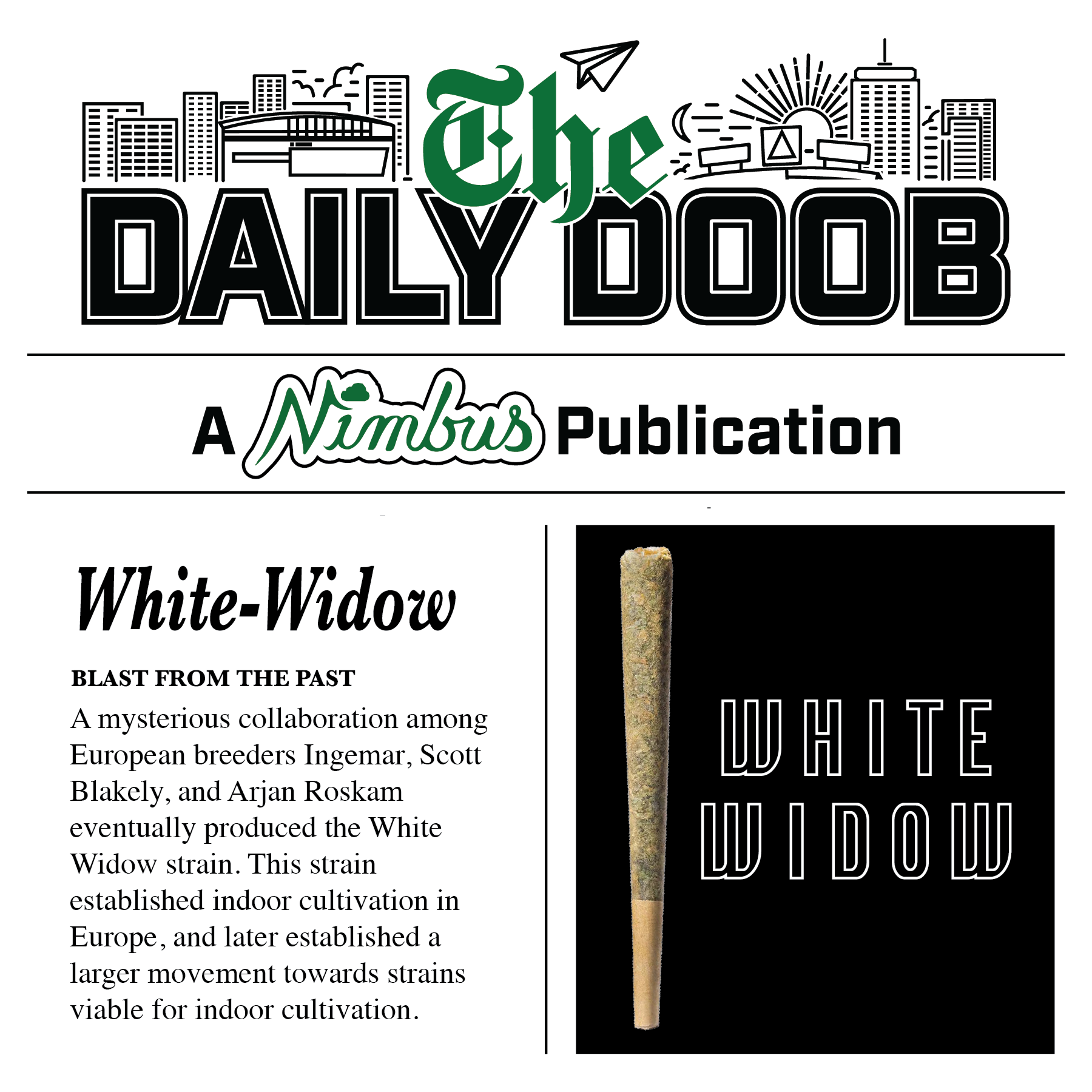 Historical Context: established indoor cultivation in Europe, and later established a larger movement towards strains viable for indoor cultivation. Original breeder/first seed popped: A mysterious collaboration among European breeders Ingemar, Scott Blakely, and Arjan Roskam eventually produced the White Widow strain.