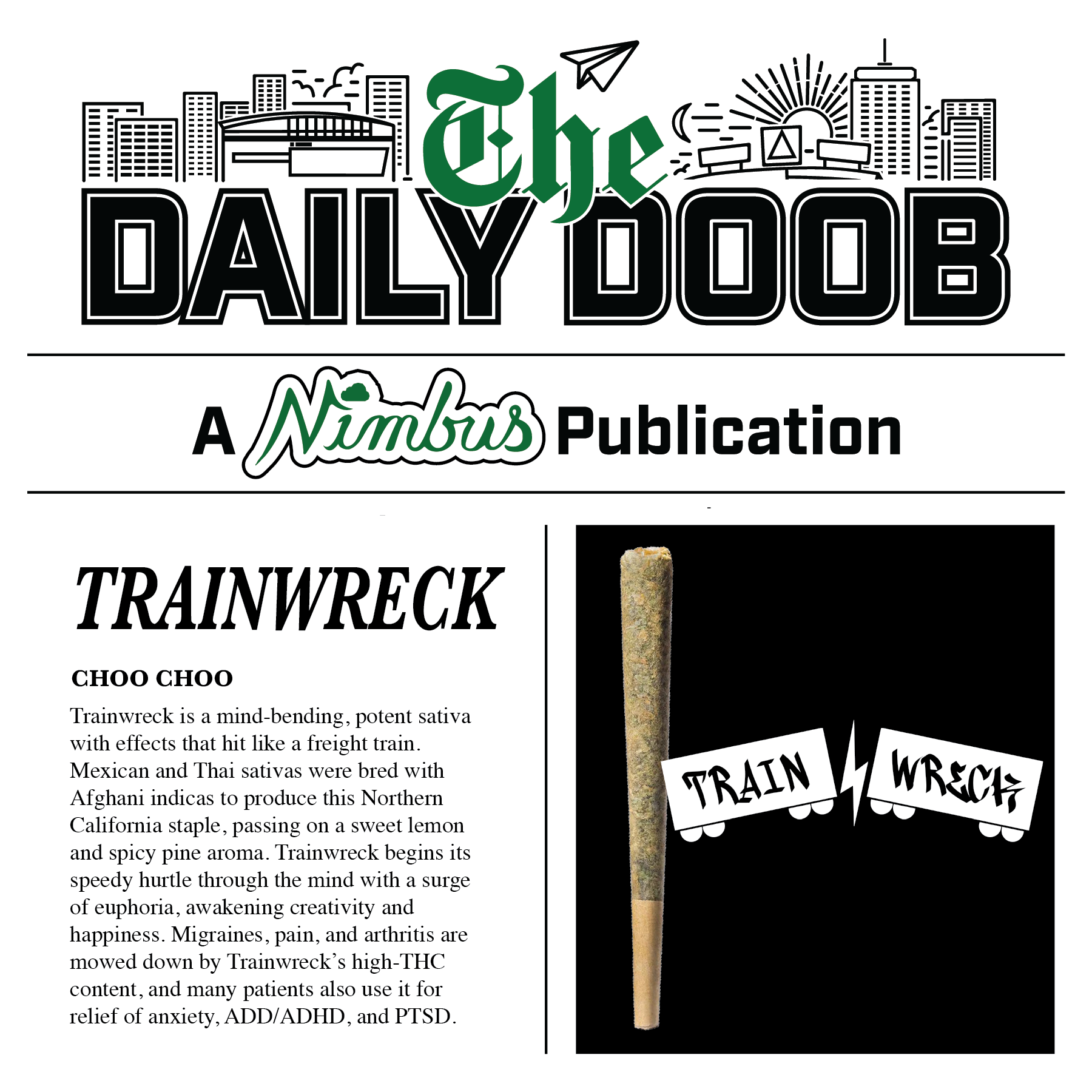 Historical Context: The first known emergence of Trainwreck in Arcata, California---a city located in NorthCal's Emerald Triangle in the 1970s. It is alleged to be grown next abonadoned railroad tracks neccessary to transport the Redwood Tree lumber down the coast. Legend has it that two brothers crossed a Mexican xThai Sativa with an Afghani Indica, and while they were heading to harvest, train crashed neat their spot. In haste, they took the plant as quickly as possbile to flee the 5-0 and named the strain Trainwreck. The strain became a West Coast staple and then began to spread across the US in the 1980s.