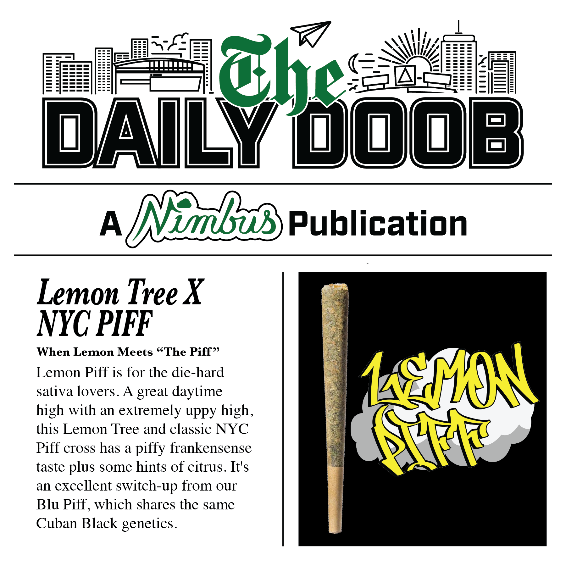 Breeder: Nimbus Cannabis Co.Lemon Piff is for the die-hard sativa lovers. A great daytime high with an incredibly uplifting high, this Lemon Tree and classic NYC Piff cross has a piffy frankensense taste plus some hints of citrus. Its an excellent switch-up from our Blu Piff, which shares the same Cuban Black genetics.