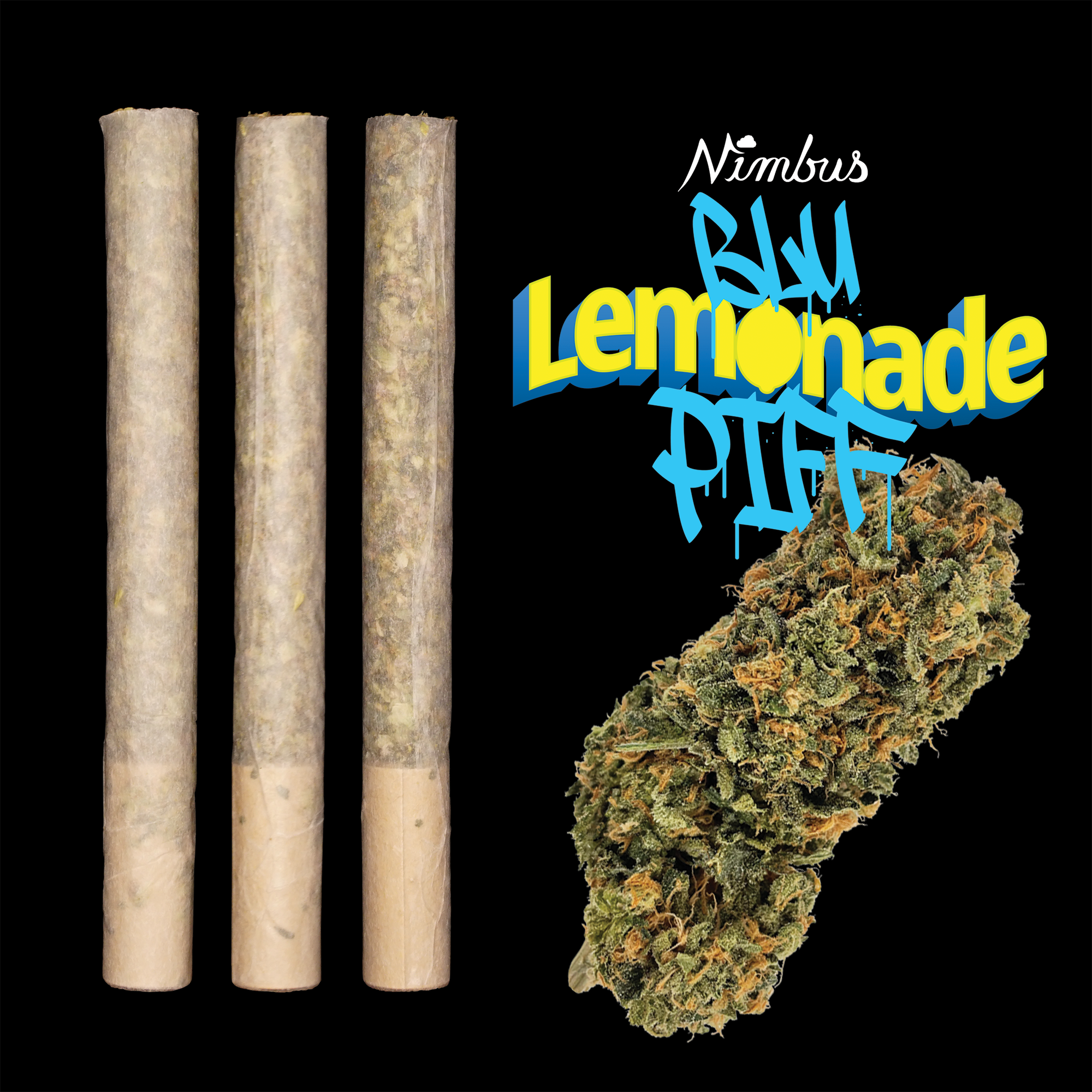 91 Lemons x Blu Piff Sativa Blu Lemonade Piff is the offspring of two strains important to the Nimbus story. It is the cross of 91 Lemons (Chem 91 x Lemon Tree) and Blu Piff (Blue Dream x Piff). In this new strain, the parent genetics collide, creating an up-and-soaring high with a terpene profile that tastes like blue lemonade.